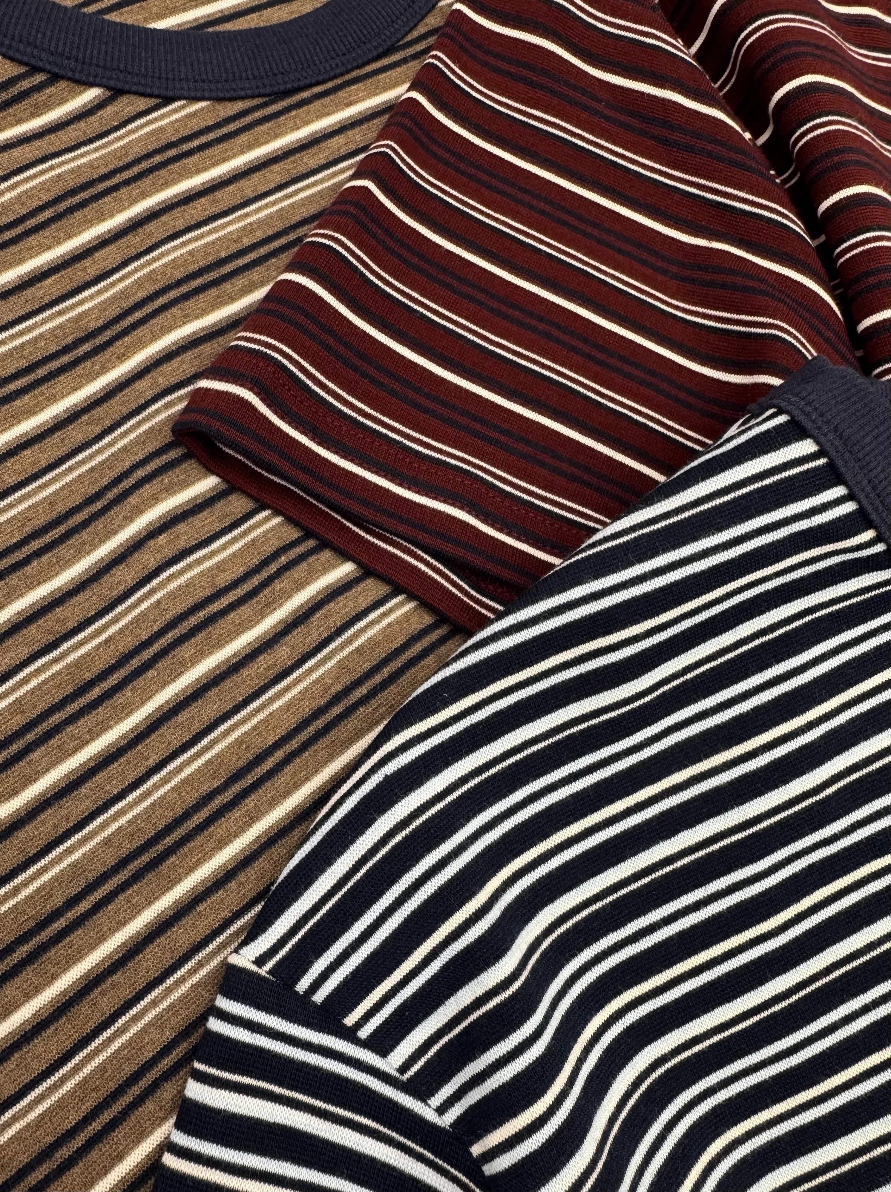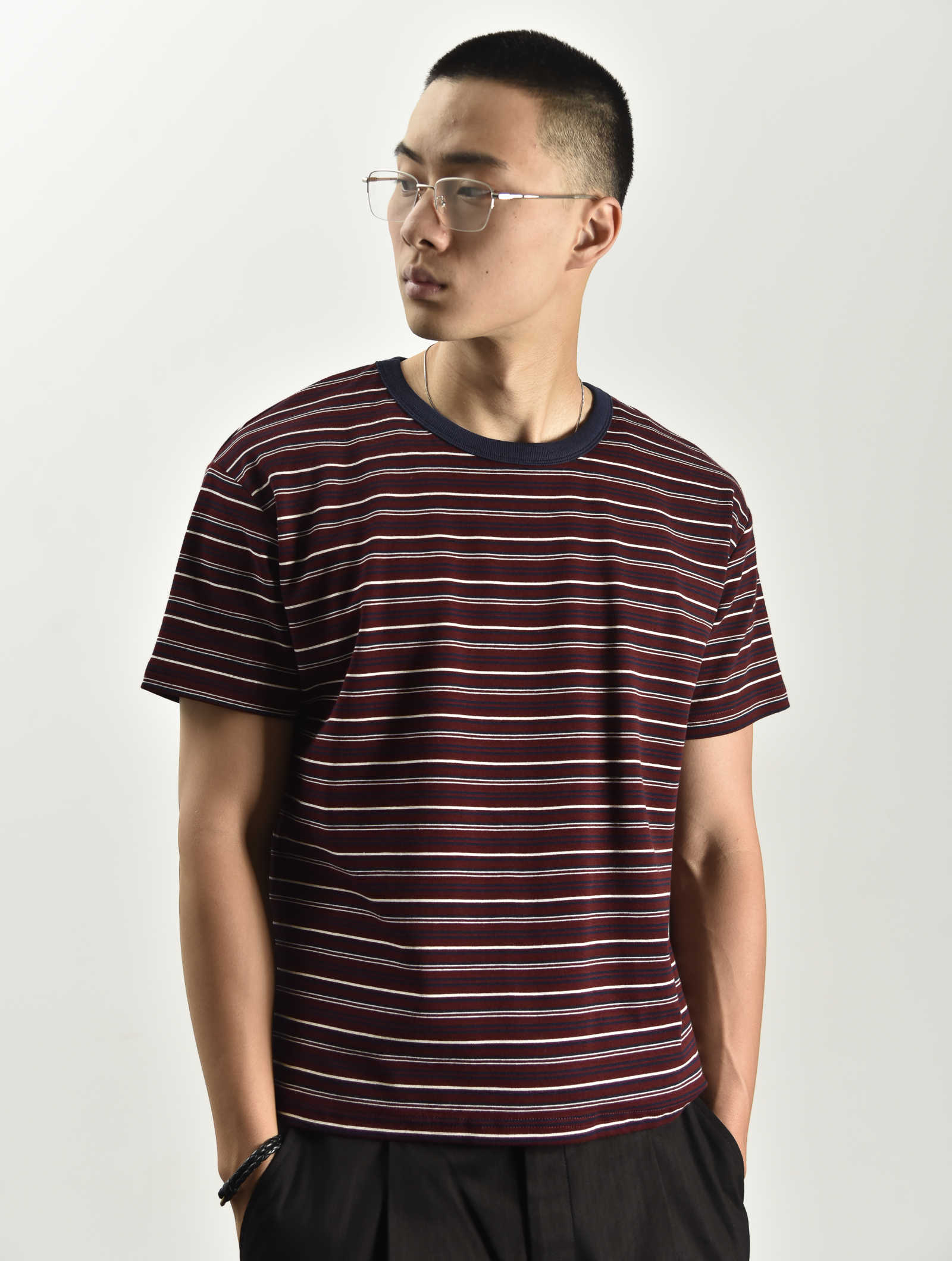 橫條紋純色短T - 酒紅色