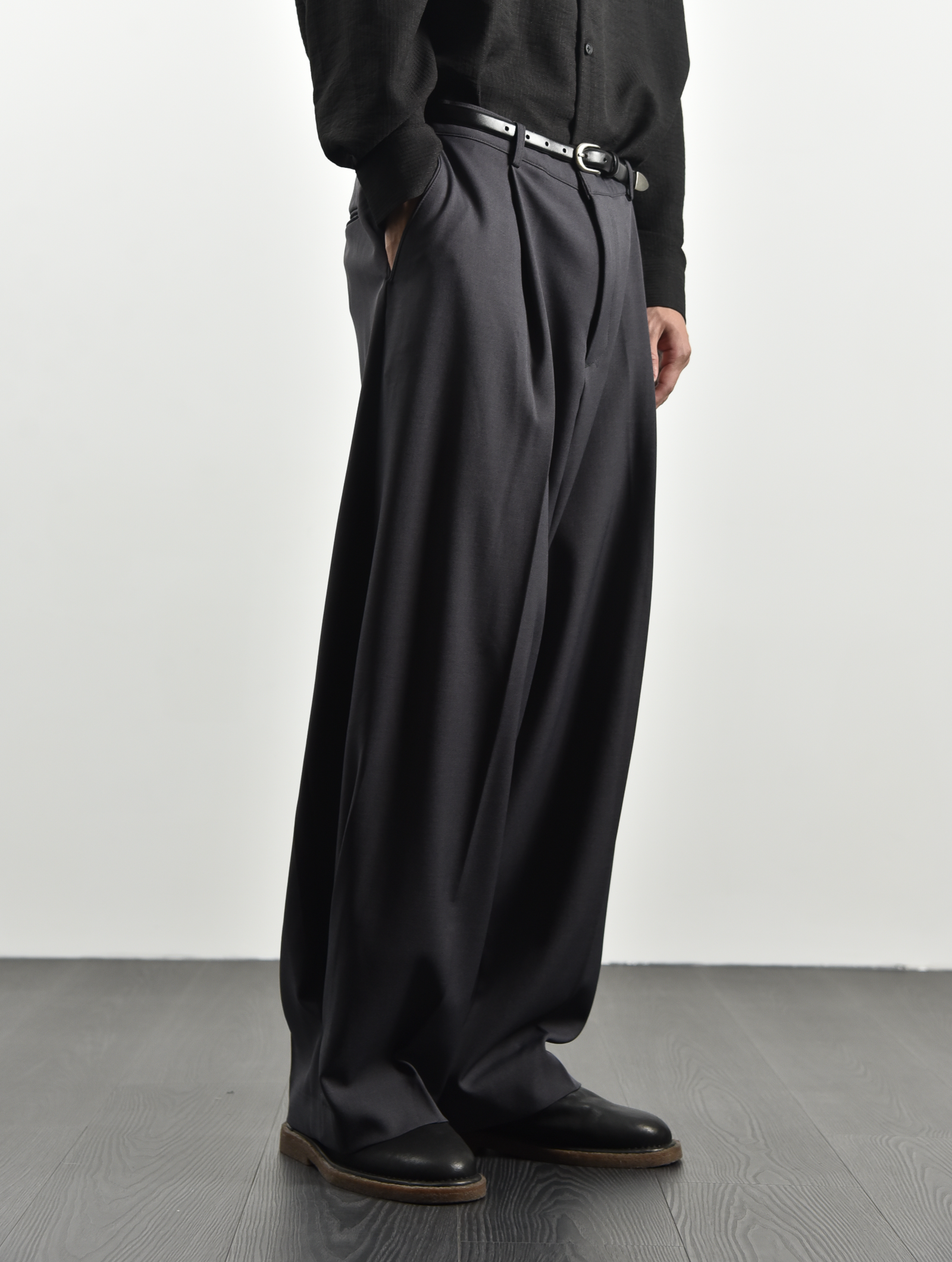 打褶直筒落地褲 - 炭灰