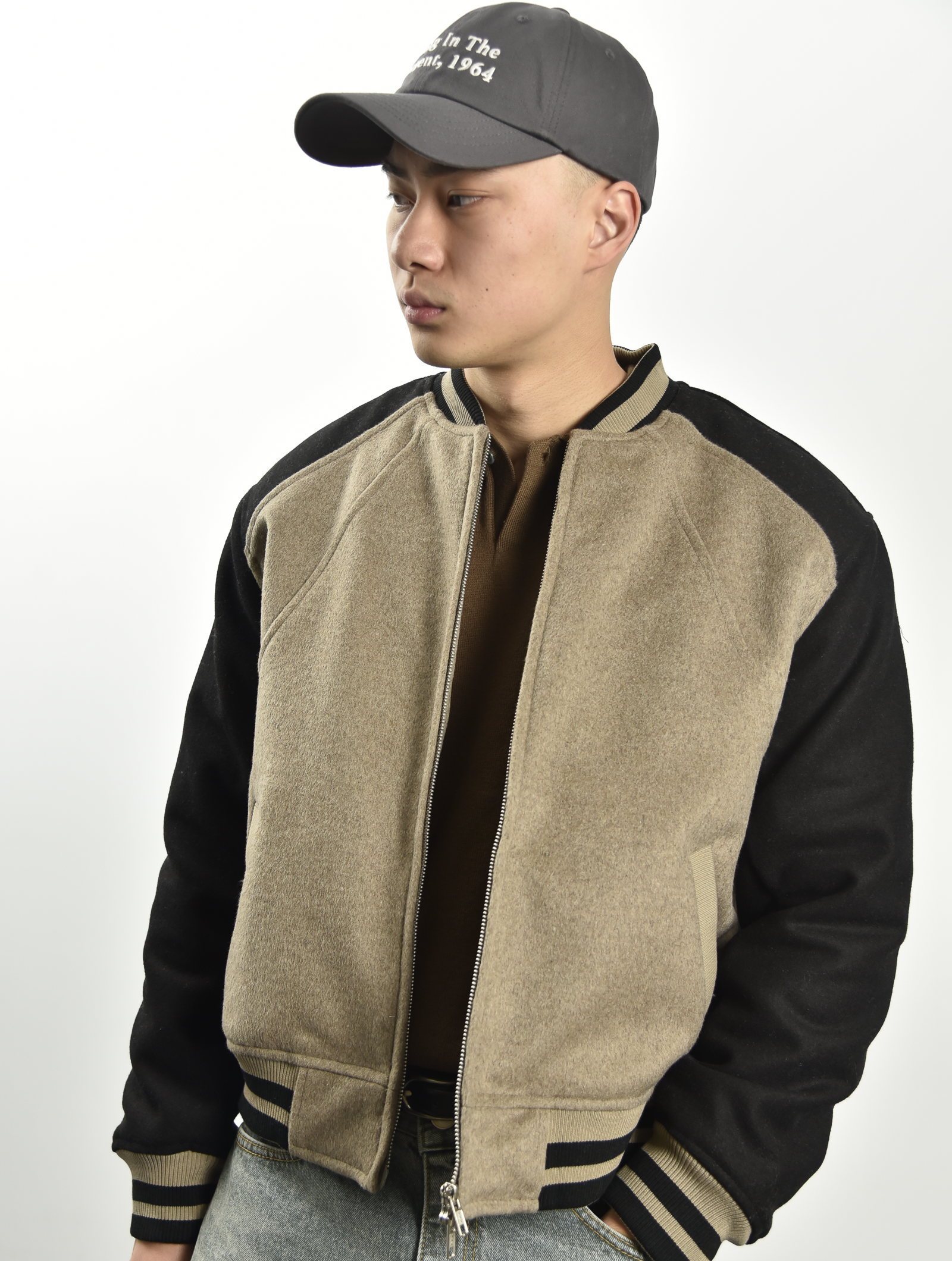 - 撞色設計搭配經典棒球外套版型,呈現率性休閒風格